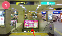 阪急豊中駅南改札出口をでると写真のように階段とエスカレーターが見えますので、1階に下りてください(①図参照)